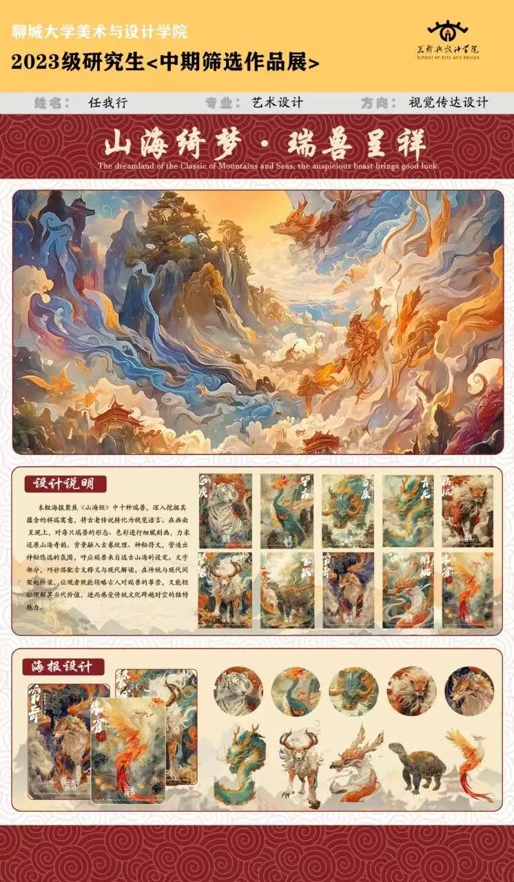 《山海绮梦・瑞兽呈祥》系列海报以现代设计语言重构《山海经》中的十大瑞兽,展现青龙腾云、白虎啸林、朱雀浴火等神话意象。画面以流动的笔触勾勒瑞兽的矫健姿态,既保留古籍中敬畏自然的古朴神韵,又以动态构图与色彩张力赋予传统图腾现代生命力。十幅作品融合神话叙事与当代视觉语法,在瑞兽翱翔潜游的瑰丽场景中,构建一座贯通古今的文化桥梁,让千年传说于斑斓色块间焕发新生。
