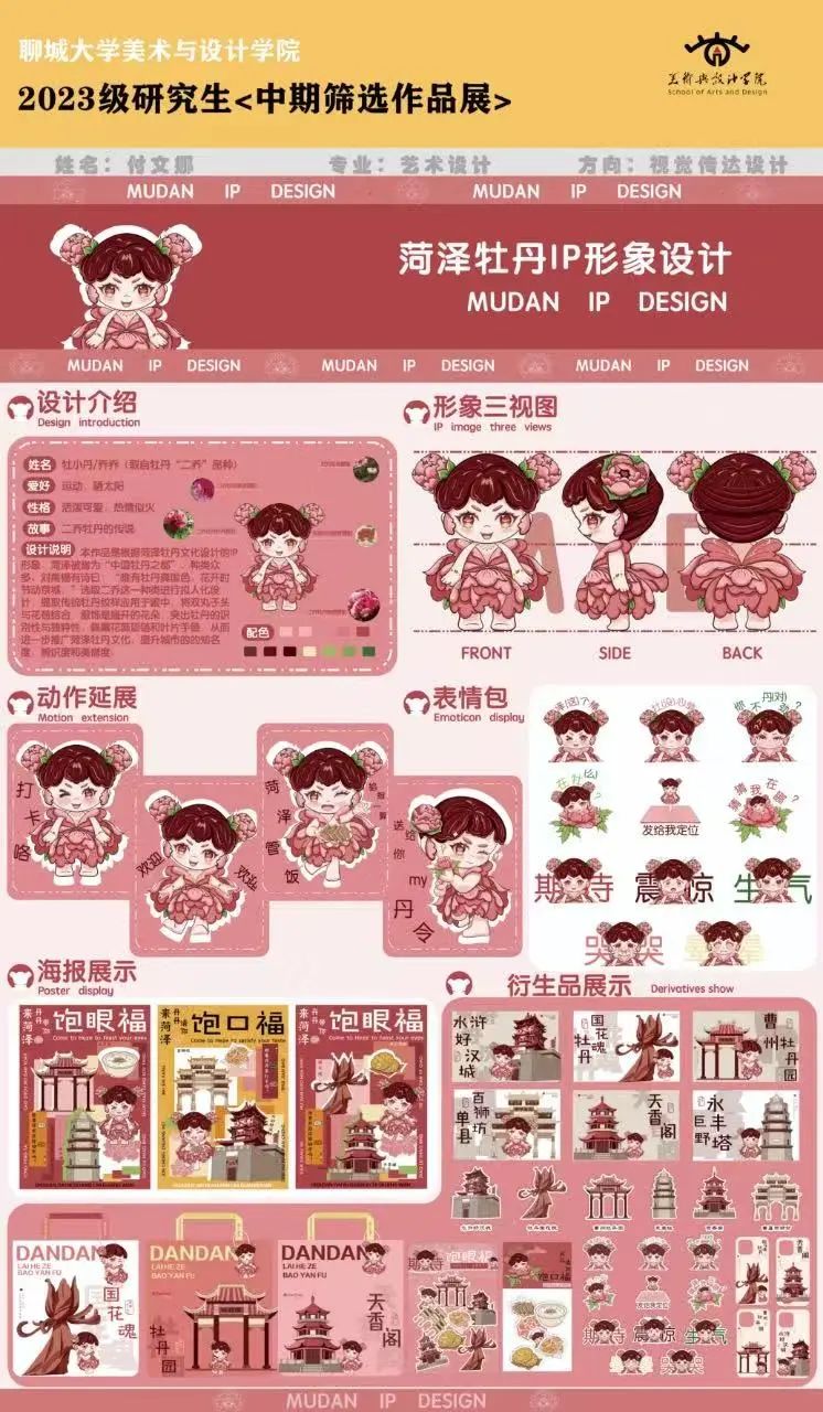 本作品以山东黄河文化沿黄流域的菏泽牡丹文化为背景进行设计。菏泽被誉为“中国牡丹之都”,选取“二乔”品种进行设计,提取传统牡丹纹样,通过可爱的卡通形象和丰富的表情包设计,再结合当地的著名建筑,传递情感和故事,使观众能够产生共鸣和情感连接,既是对传统黄河文化的现代诠释,也是对菏泽地域特色的精致呈现,从而进一步推广菏泽牡丹文化,提升城市的知名度,辨识度和美誉度。