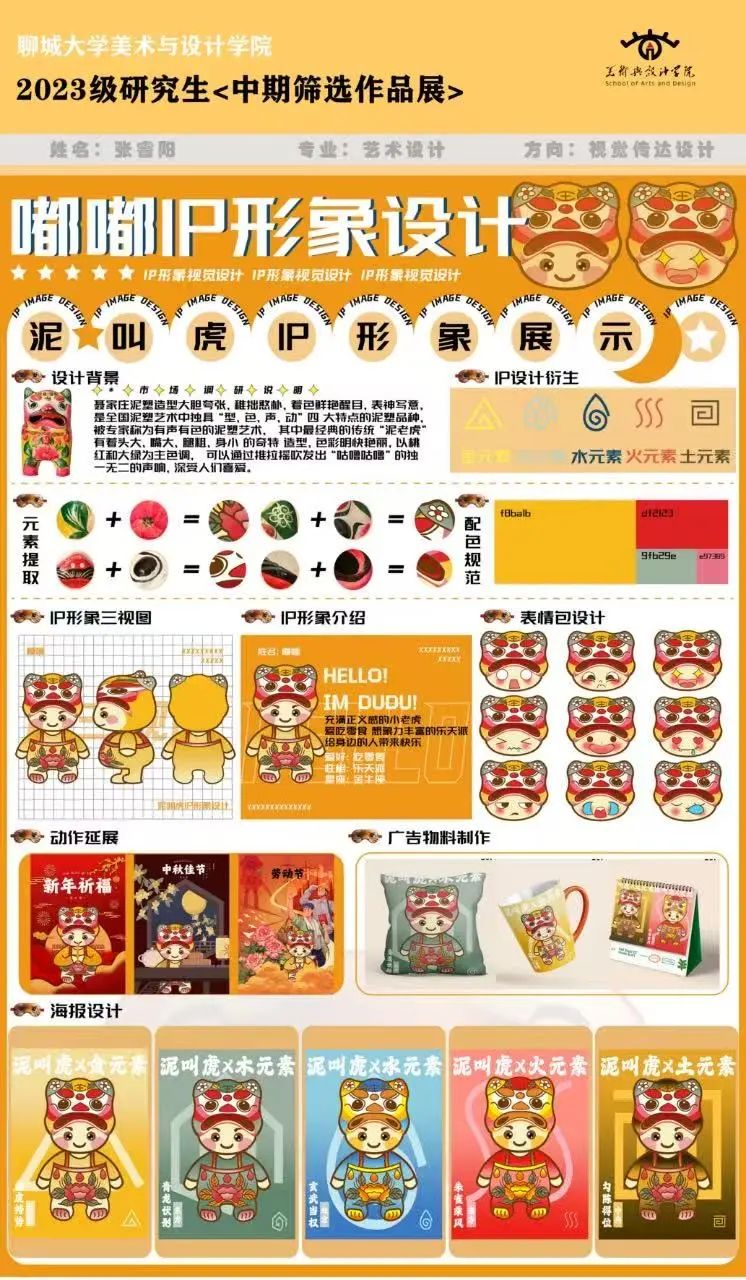 聂家庄泥叫虎IP形象设计说明:本设计以非遗聂家庄泥塑为灵感,提炼传统泥叫虎憨态可掬的造型精髓,结合现代萌趣审美打造文化IP。主体形象以圆润饱满的虎身为基础,保留标志性昂首啸天姿态,简化传统彩绘纹样为流畅色块,虎面以抽象化“王”字纹点睛,虎耳缀以牡丹祥云浮雕,呼应高密年画元素。色彩沿用朱红、明黄与石青三原色,通过渐变晕染增强立体感,模拟泥胎质朴肌理,传递“虎佑平安”的吉祥寓意。形象可增设张嘴吹气、虎尾摇摆等动态延展,适配文创产品与数字化传播。整体设计在保留乡土艺术基因的同时注入年轻活力,以亲和力载体推动非遗文化的创新传承。