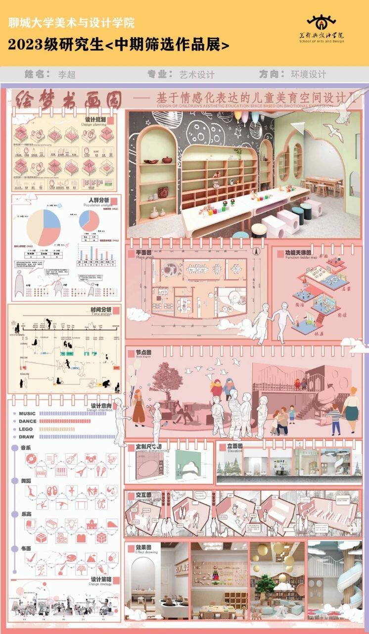 现代幼儿美术教育不仅注重技能的培养,更关注儿童情感和心理的健康发展。本设计以情感化表达为研究主题。围绕绘画、书法、娱乐、陶艺、启蒙、手工等多功能区域,探讨如何通过情感化的空间设计,提升儿童在美术教育中的体验。