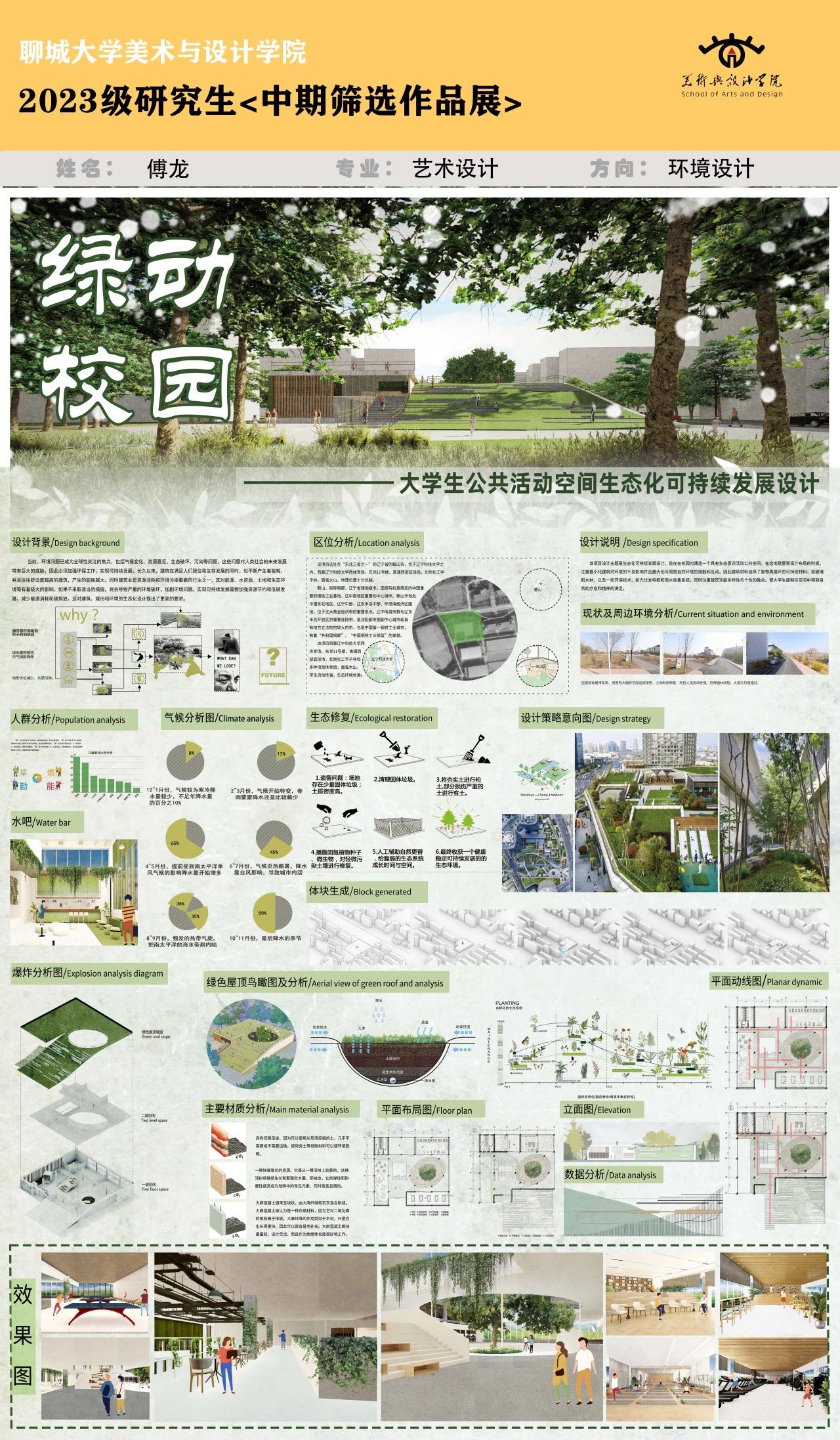 该项目设计主题是生态化可持续发展设计,旨在在校园内建造一个具有生态意识活动公共空间,在选地建屋和设计布局的时候,注重最小化建筑对环境的不良影响并且最大化与周围自然环境的接触和互动。因此建筑材料选择了废物再循环的可持续材料,如玻璃和木材,以及一些环保技术,如光伏发电板和雨水收集系统。同时注重建筑功能多样性与个性的融合。使大学生能够在空间中得到自然的疗愈和精神的满足。