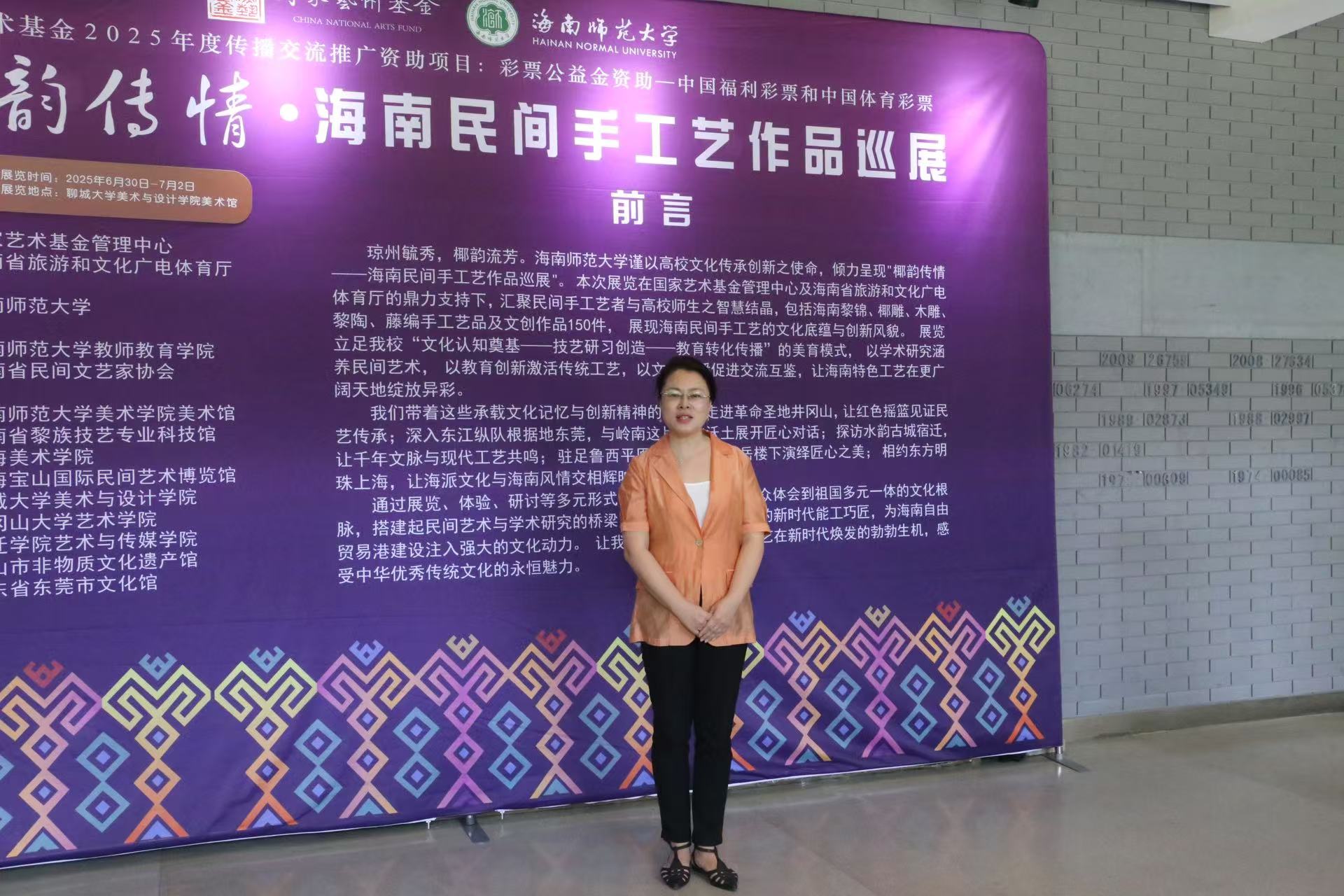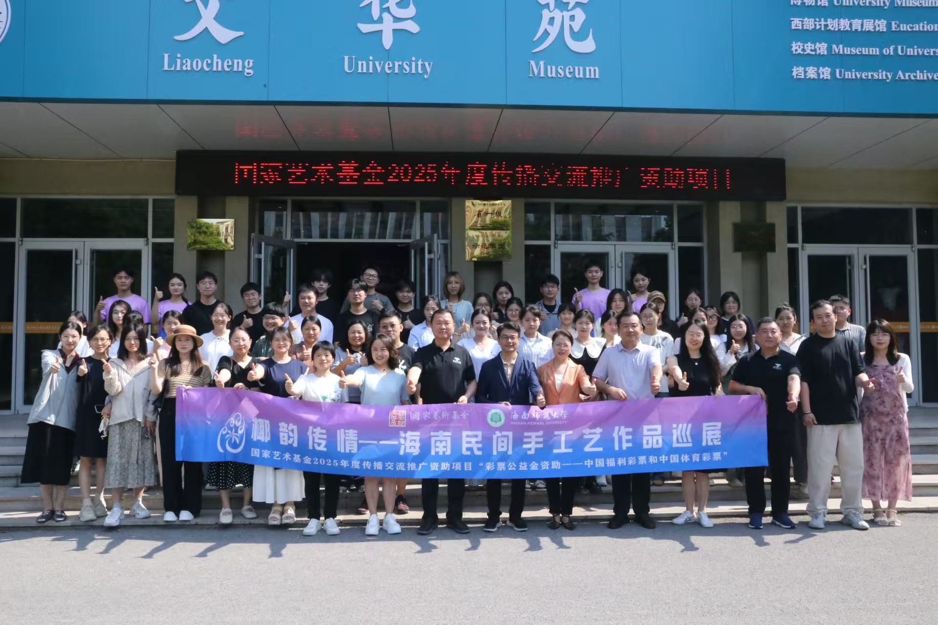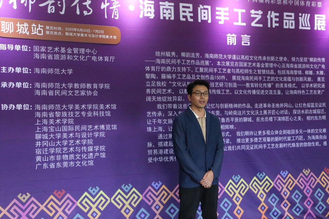 6月30日,国家艺术基金2025年度传播交流推广资助项目“椰韵传情・海南民间手工艺作品巡展聊城站”开幕式在四虎 美术馆举行。本次展览以海南民间手工艺为载体,搭建琼鲁两地文化交流的桥梁,展览呈现了海南黎锦、椰雕、木雕、黎陶、藤编五大传统工艺的150件精品力作,全方位展现了海南民间手工艺的深厚底蕴与时代风采。