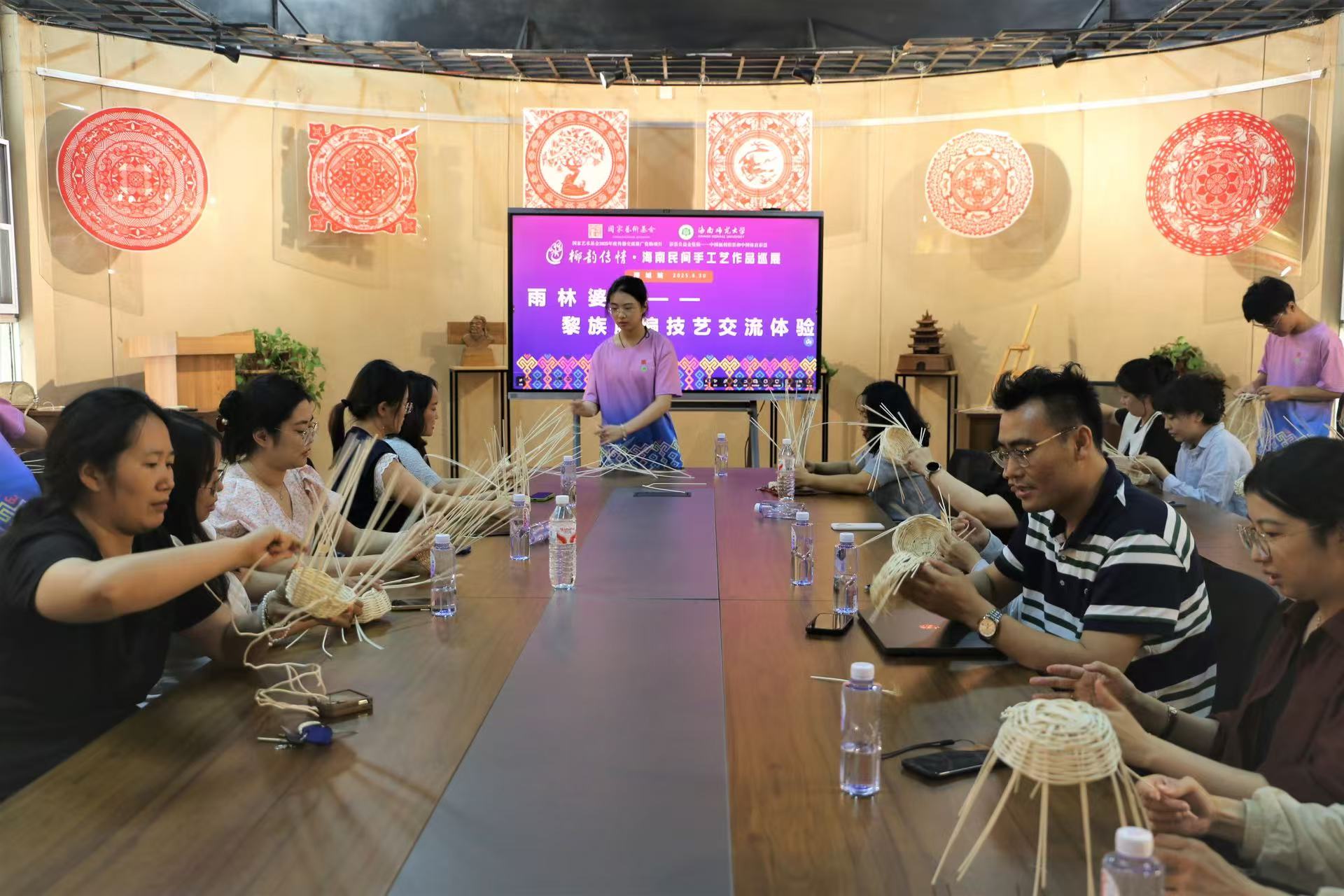 海南师范大学美术学院副院长朱丹老师宣布展览开幕。开幕式结束后,在四虎 一楼多功能厅举办了“海南民间手工艺保护与传承”研讨活动及手工艺体验工作坊,邀请专家与观众面对面交流,并提供海南藤编技艺的实践体验,让参与者在动手操作中更深入理解传统工艺的魅力。