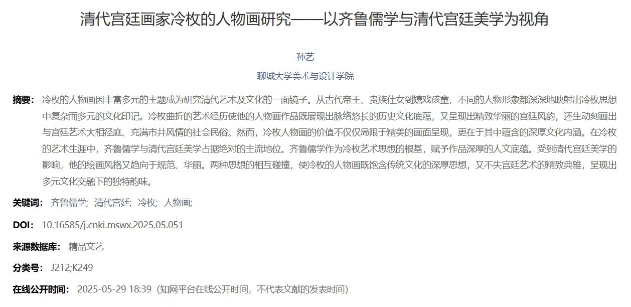 2025年5月论文《清代宫廷画家冷枚人物画研究——以齐鲁儒学与清代宫廷美学为视角》发表于《美术文献》;
