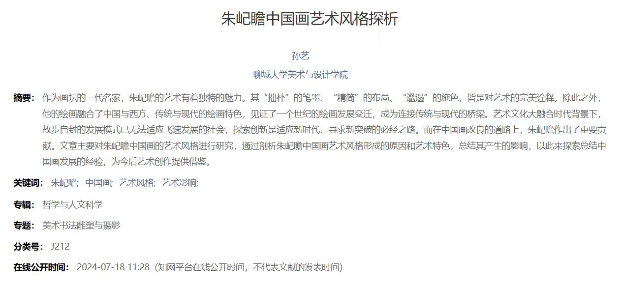 2024年4月论文《朱屺瞻中国画艺术风格探析》发表于《爱尚美术》。